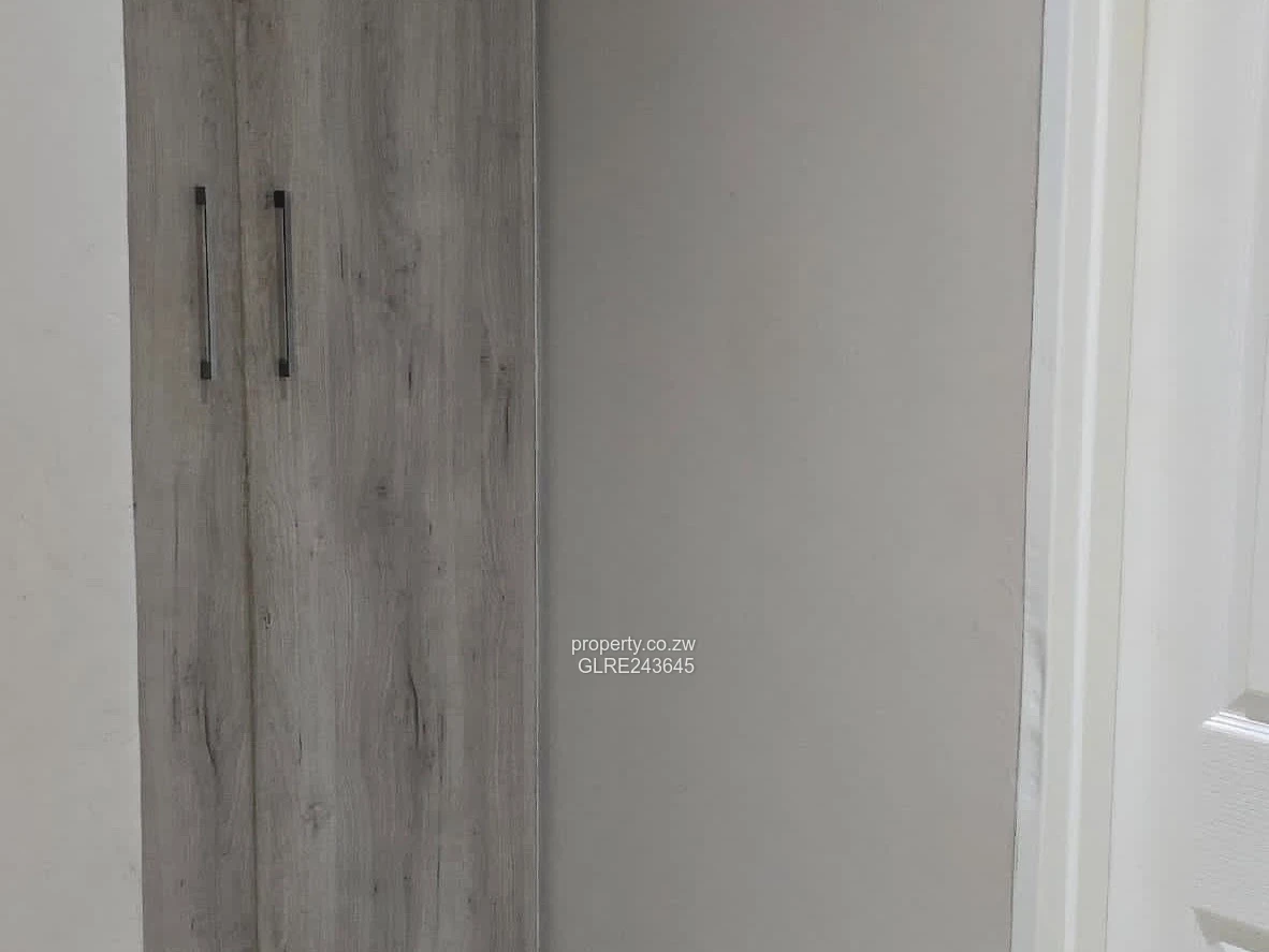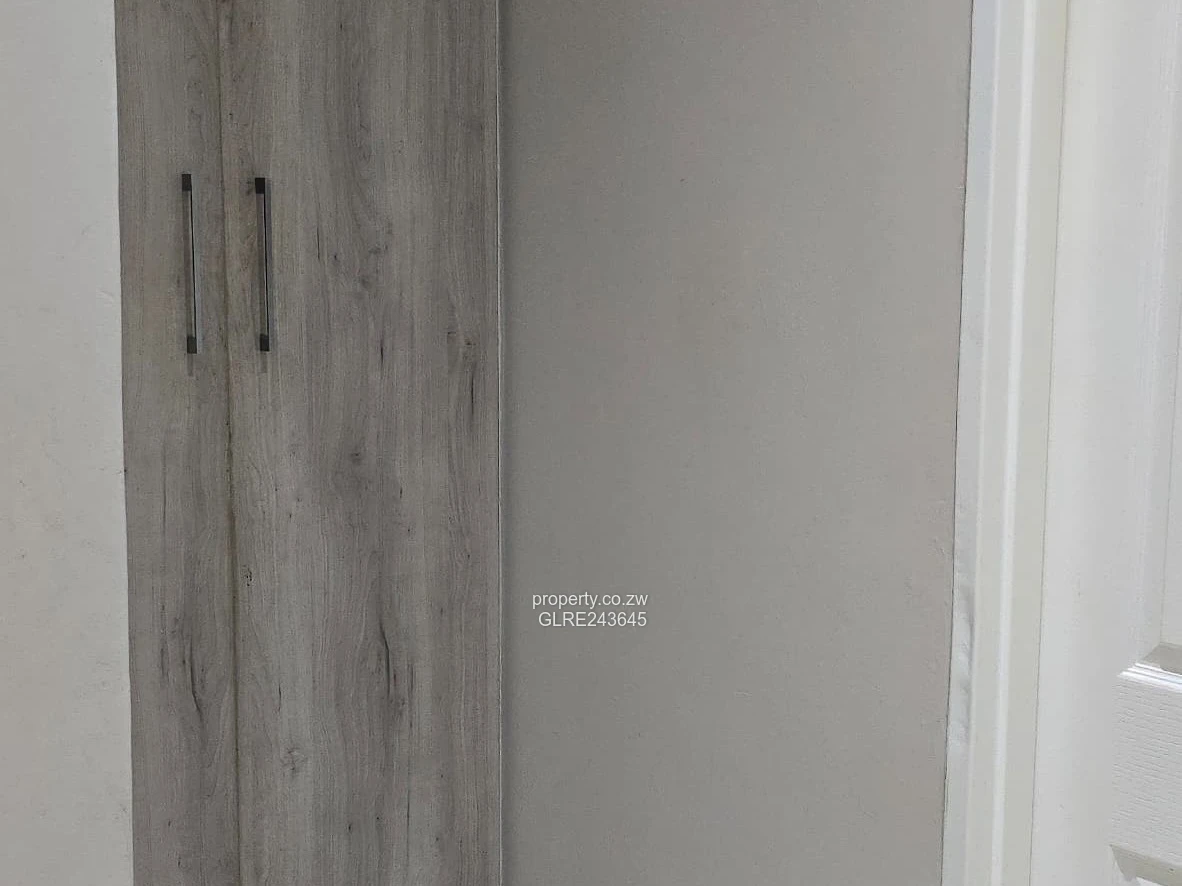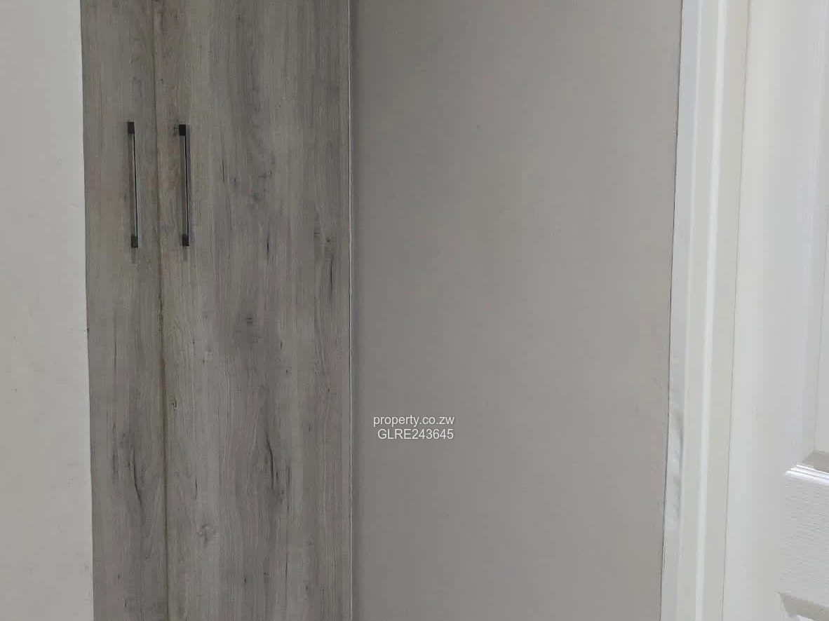 Bright two-bedroom, one-bath flat for rent in Ashdown Park, Harare West — modern, secure and move-in ready. The apartment features an open-plan living area with high ceilings and a contemporary kitchen complete with sleek white cupboards, breakfast bar, gas hob and room for a full-size fridge (see kitchen photos). The bathroom is tiled with a frameless glass shower enclosure for a clean, modern finish. Outside, the unit sits on a generous 550 m² stand with 400 m² built area and a fully paved courtyard offering easy parking and low maintenance. A prominent borehole-fed water storage tank ensures reliable water supply (photo shows the elevated storage tank and pump setup), and the property is enclosed by a secure brick perimeter. Ideal for professionals, small families or couples seeking comfort and convenience in Harare West. Contact to arrange a viewing.