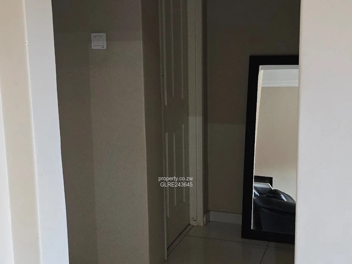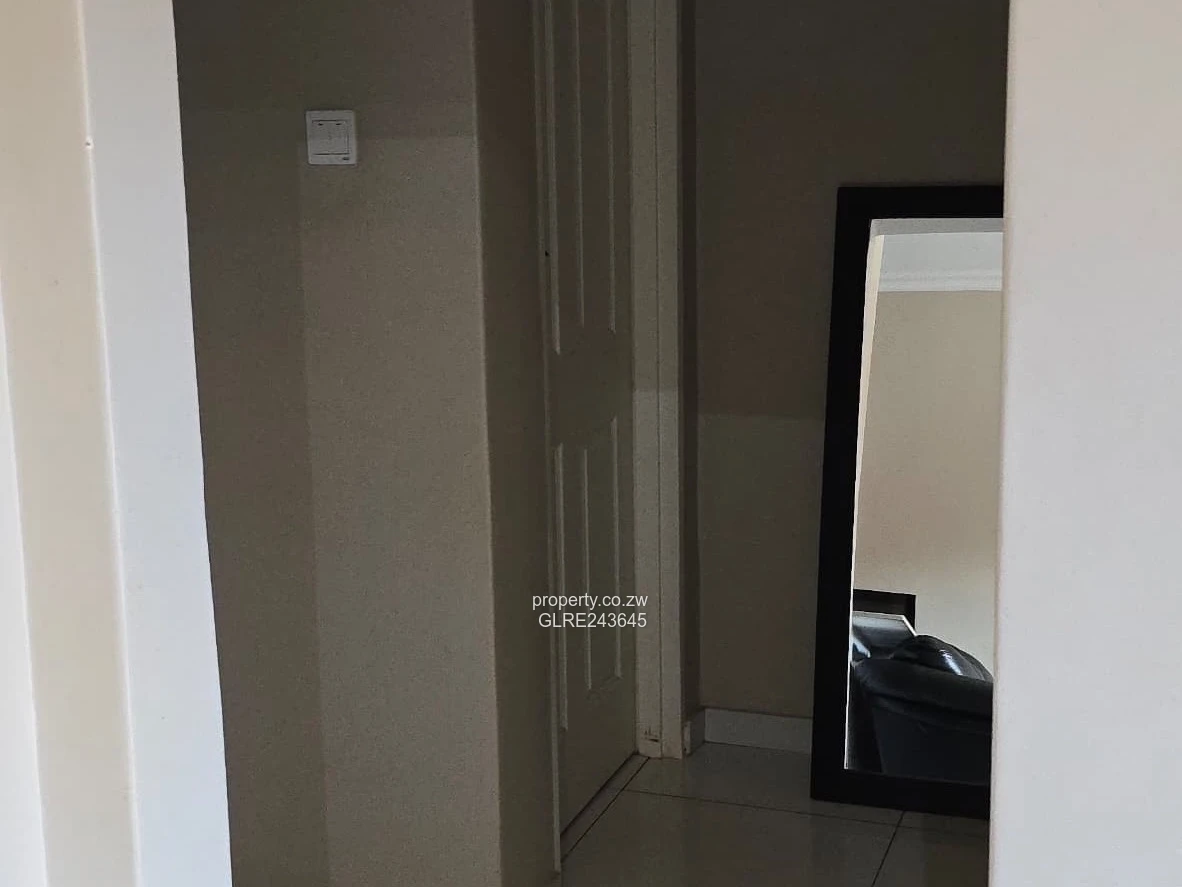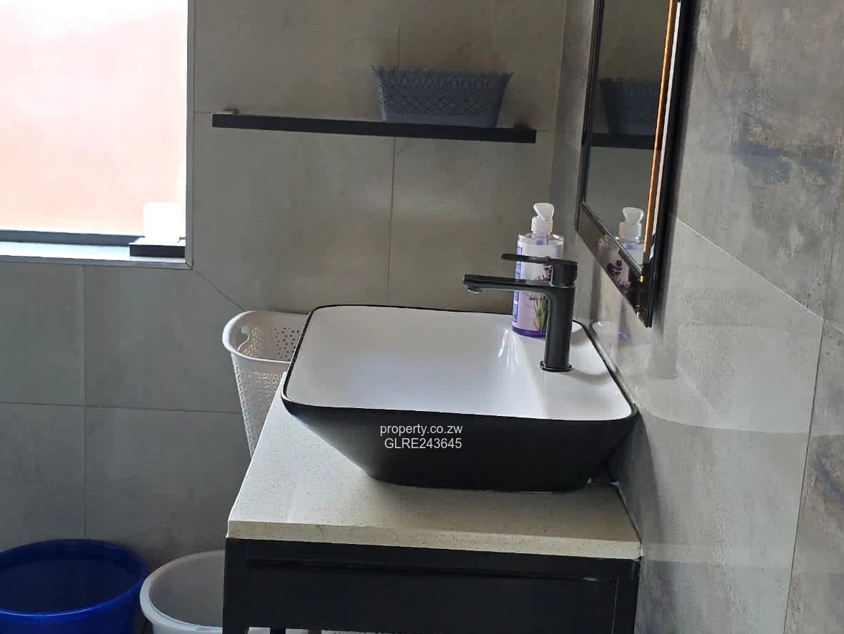 Bright two-bedroom, one-bath flat for rent in Ashdown Park, Harare West — modern, secure and move-in ready. The apartment features an open-plan living area with high ceilings and a contemporary kitchen complete with sleek white cupboards, breakfast bar, gas hob and room for a full-size fridge (see kitchen photos). The bathroom is tiled with a frameless glass shower enclosure for a clean, modern finish. Outside, the unit sits on a generous 550 m² stand with 400 m² built area and a fully paved courtyard offering easy parking and low maintenance. A prominent borehole-fed water storage tank ensures reliable water supply (photo shows the elevated storage tank and pump setup), and the property is enclosed by a secure brick perimeter. Ideal for professionals, small families or couples seeking comfort and convenience in Harare West. Contact to arrange a viewing.