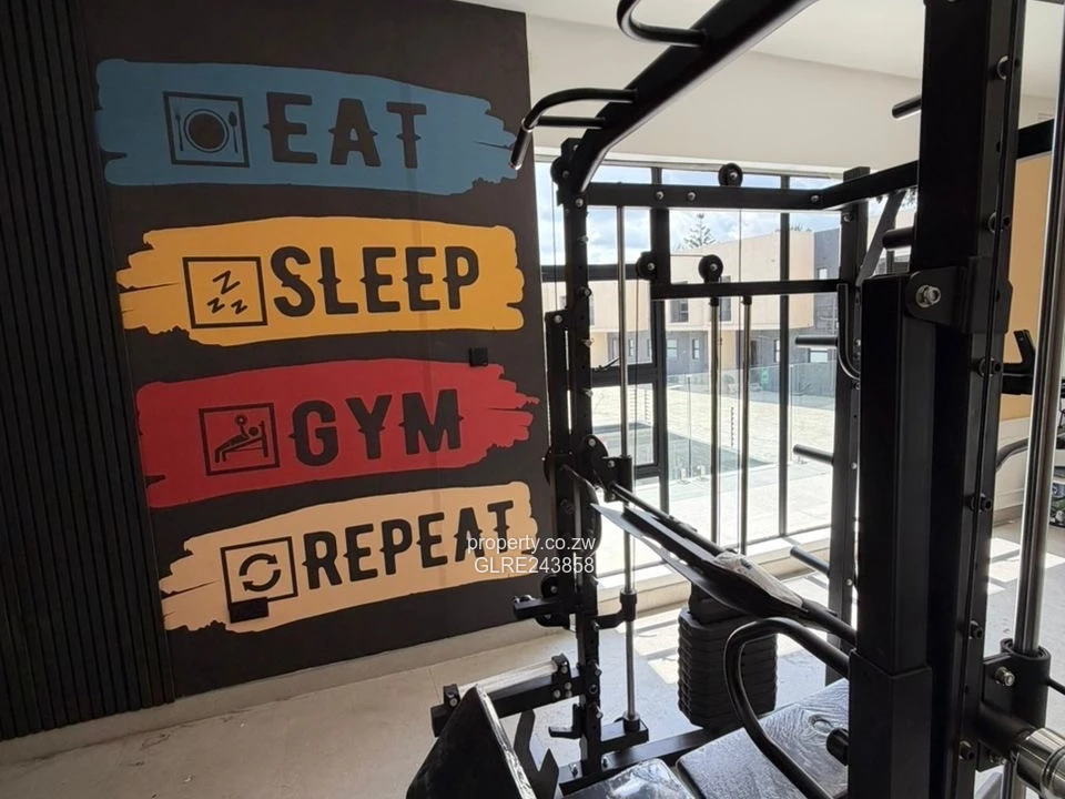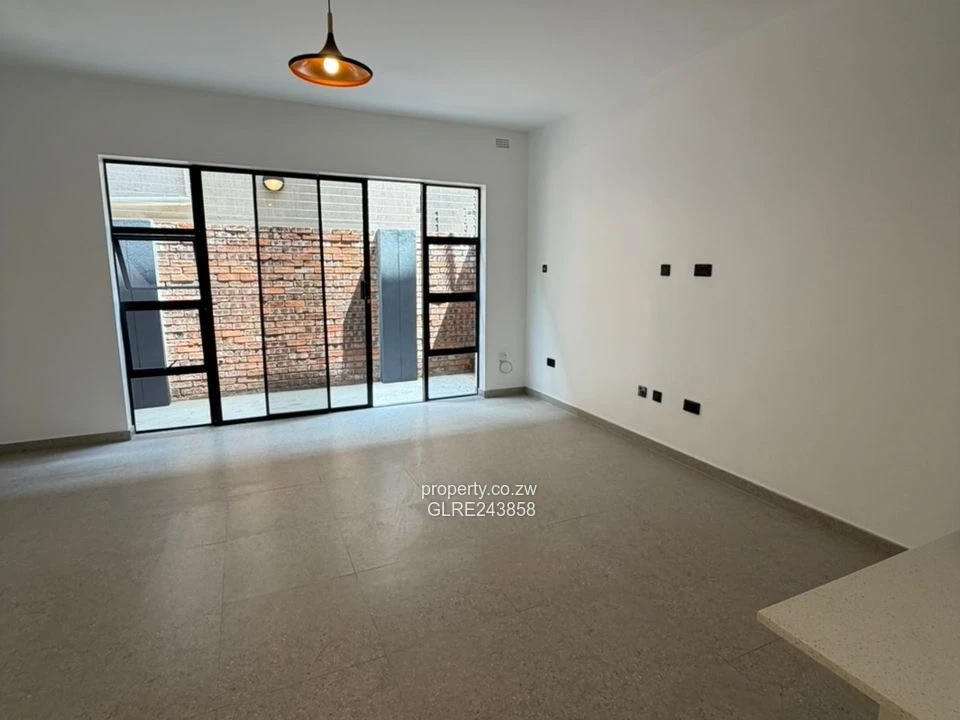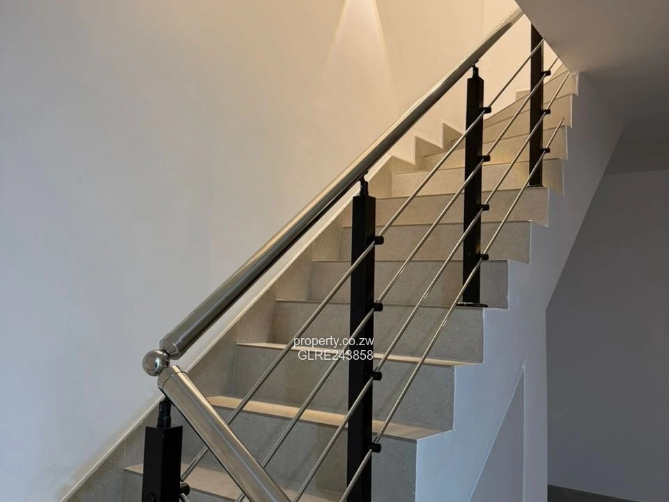 Contemporary 2-bedroom, 2-bath apartment for rent in Strathaven, Harare West — a stylish, secure complex set on a 550 m² stand with a total built area of 450 m². Bright open-plan living flows to a glass-balustrade balcony overlooking the central swimming pool (see photo), perfect for relaxed weekends and entertaining. The kitchen is finished with crisp white cabinetry, wood-tone accents, a matte black sink and freestanding oven, offering a modern, efficient workspace. Interior details include a stainless-steel handrail staircase, frameless glass shower enclosures and built-in wardrobes in the bedrooms, all shown in the images. Communal courtyard parking and landscaped communal areas surround the pool, while an on-site borehole ensures reliable water supply. Ideal for professionals or small families seeking contemporary finishes, secure living and low-maintenance comfort in a convenient Harare West location. Arrange a viewing today to experience the apartment and complex first-hand.