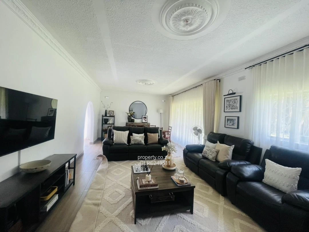 Stylish single-storey family home in sought-after Sunridge, Harare West — set on a generous 1,073 m² stand with 600 m² building area. The attractive grey exterior with brick pillar detail and chimney gives way to a bright, tiled interior offering 4 bedrooms (main en suite) and 2 bathrooms — the main bathroom comfortably fitted with a bathtub and a separate shower. The fitted kitchen flows into open living spaces and a covered verandah that overlooks a well-kept lawn and mature shrubbery, perfect for entertaining or family play.
