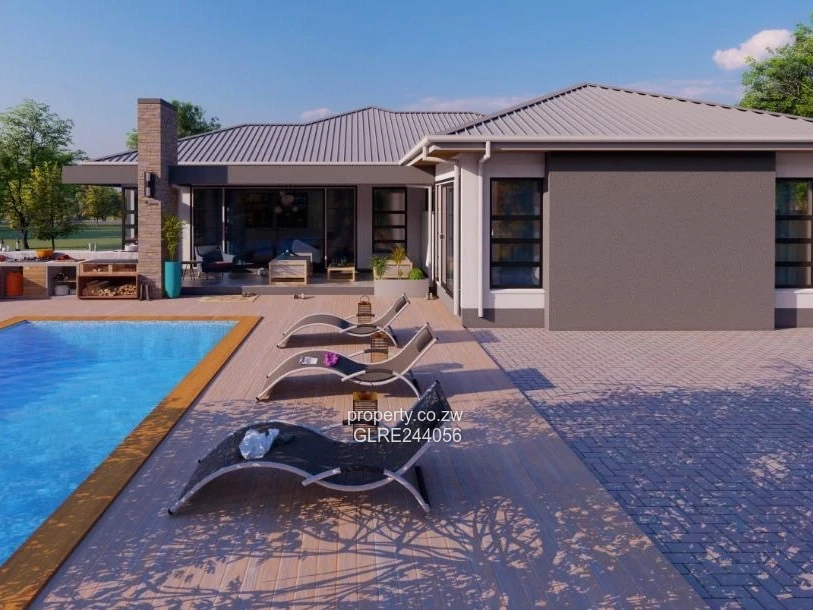 Images show a light-filled layout, a sleek swimming pool with timber decking and loungers, a paved terrace with an outdoor chimney/braai feature and expansive lawn — perfect for children and gardening. The aerial view highlights the thoughtful single-storey footprint and circulation between living, sleeping and entertainment wings; on-site progress photos confirm quality construction and finishing works nearing completion. Tiled floors throughout, secure parking, and a private garden complete this low-maintenance, high-lifestyle home — ideal for a growing family seeking comfort, privacy and exceptional outdoor living in North Harare.